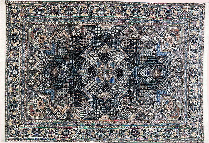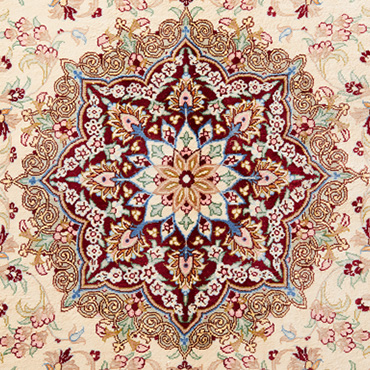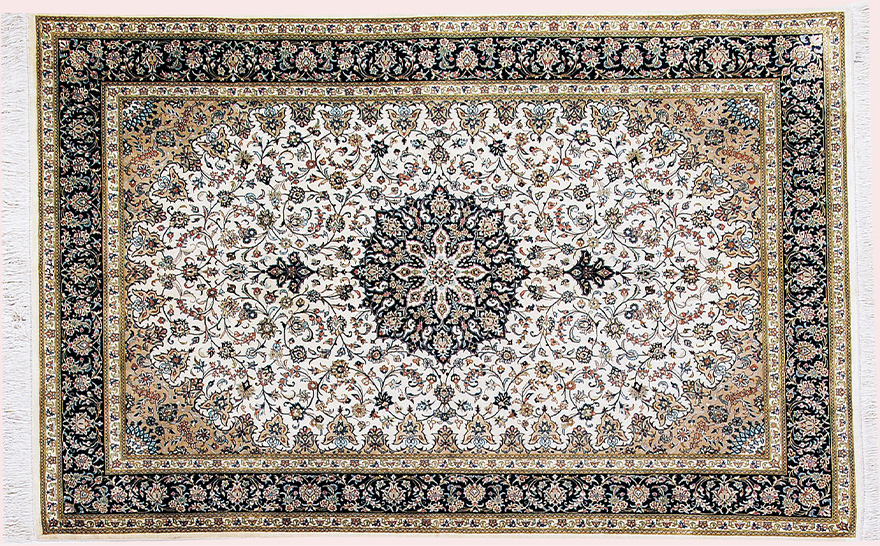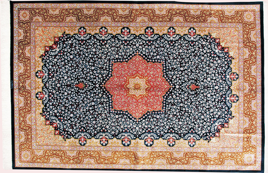 「メダリオン」…ペルシャ絨毯でよく見られる、円形もしくは円に近い形の模様を中心に配置したもの。加えて四隅にも同様の模様を配置している。