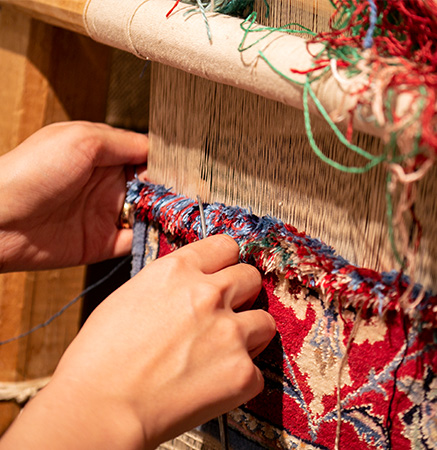 絨毯は織機によって作られます。縦糸を張り、横糸を絡ませながら布状のものにしていきます。中東の手織り絨毯は、壁に沿って直立した織機を使います。縦糸はコットンまたはウール。絨毯は表面に毛足(パイル)を出していくため、縦糸に横糸を絡めては切り絡めては切り、という作業を繰り返します。細かい模様を正確に作り出すために一つ一つの横糸の配置が作られています。