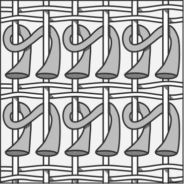 絡め方には「ペルシャ結び」と「トルコ結び」があります。ペルシャ結びは、2本の縦糸に対し、横糸を1本にくるりと回し、もう1本の縦糸に引っ掛ける状態になっています。トルコ結びは横糸を2本の縦糸の外側から回し、2本の間から横糸を出していきます。